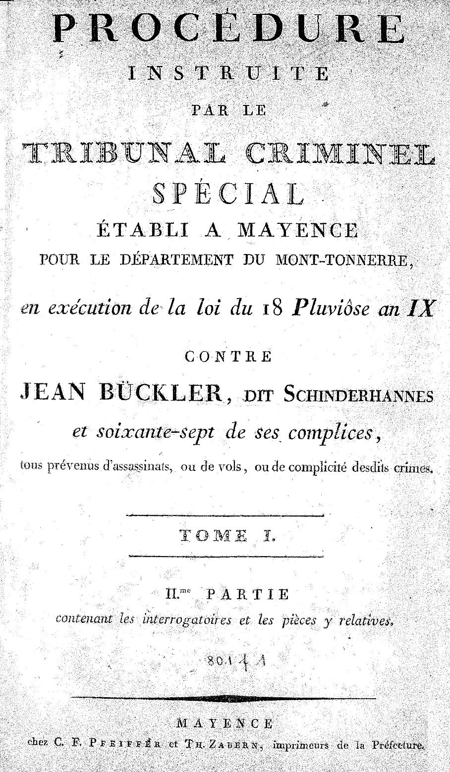 12. Ein großer Schauprozess wurde jetzt von der französischen Justiz gegen eine Schinderhannes-Bande veranstaltet, die es in Wirklichkeit nie gegeben hatte. Dies zuzugeben, kam natürlich nicht in Betracht, nachdem gegen sie sogar Militär in Bewegung gesetzt worden war. Die Besatzer hätten sich dann lächerlich gemacht. Um den gewünschten Prozess gegen eine Bande führen zu können, musste aber erst einmal eine Bande da sein. Was die Justiz wusste, reichte jedenfalls nicht aus, um eine solche vor Gericht zu bringen. Hier aber half Schinderhannes aus der Patsche. Um eine Kronzeugenregelung bemühte er sich nicht. In der Illusion, mit bedingungsloser Kooperation seinen Kopf freikaufen zu können, schritt der berühmteste der deutschen Räuber zum vermutlich größten Verrat, den die Geschichte des Räuberwesens kennt. Alle 19 mit ihm Guillotinierten brachte er durch seinen Verrat in Haft, von vielen davon hätte die französische Justiz ohne diesen gar nichts gewusst. Unter den so durch ihn auf die Guillotine Gekommenen waren mehrere Bauern, die sich ein einziges Mal zu einem dann abgebrochenen Überfall von Schinderhannes hatten bereden lassen! Während eine Reihe tatsächlich gefährlicher Ganoven, die meist ebenfalls nur einmal mit Schinderhannes in Berührung gekommen waren, auf der rechten Rheinseite nicht zu packen war. Für Überfälle auf Häuser auf dem Lande konnte die französische Justiz Sondergerichte einsetzen, die ausnahmslos die Todesstrafe zu verhängen hatten. In diesem Rahmen auf ein wenigstens formal rechtsstaatliches Verfahren bedacht, nahm sie sich fünf Vierteljahre Zeit, um eine mehrere tausend Seiten starke Prozessdrucksache zu erstellen. Sie ist die Hauptquelle für die Schinderhannes-Forschung (zugänglich gemacht durch die Digitalisierung von Udo Fleck und erste Aufarbeitung von Peter Bayerlein). Die französische Justiz schaltete auch den seinerzeit bedeutendsten Juristen des linksrheinischen Deutschlands, den führenden deutschen Republikaner Rebmann als Richter ein. Er gab sich als solcher dazu her, das „Gemetzel“ (Gensicke) an 20 teilweise im wahrsten Sinne des Wortes bloßen „Mitläufern“ auf den Weg zu bringen. Bis zuletzt sprach er von einer „Bande“ des Schinderhannes, obwohl er es jedenfalls besser wissen konnte. Dass darüber im Verlaufe der sich über einen Monat hinziehenden mündlichen Verhandlung überhaupt diskutiert wurde, findet sich nicht überliefert. Die linksrheinische Berichterstattung über den Prozess stammte nämlich vollständig von einem Freund Rebmanns und Protegé der Besatzungsmacht, und sie wurde rechts des Rheins einfach übernommen. An dem Begriff „Bande“ wurde nicht gekratzt und publikumswirksam Schinderhannes als tragisch auf die schiefe Bahn geratener leider unwiederbringlich verlorener Sohn dargestellt. Mit seinen Kumpanen, die sein Schicksal teilten, beschäftigte man sich nicht weiter. Gerade durch das Massaker vom 21. November 1803 ist indes der Mythos von der imaginären „Schinderhannes-Bande“ unsterblich geworden.