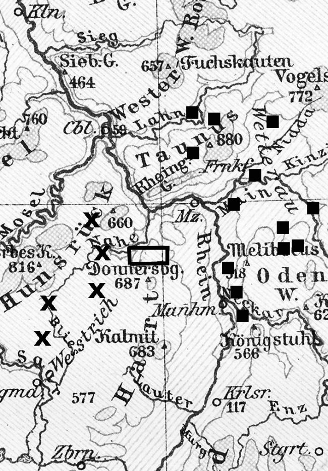 Aufenthalte und Überfälle von Schinderhannes 1801/02 Würfel: Belegte Aufenthalte von Schinderhannes auf dem rechten Rheinufer X: Linksrheinische Überfälle Januar bis September 1801 Viereck: „Schinderhannes-Land“ September 1801 bis März 1802