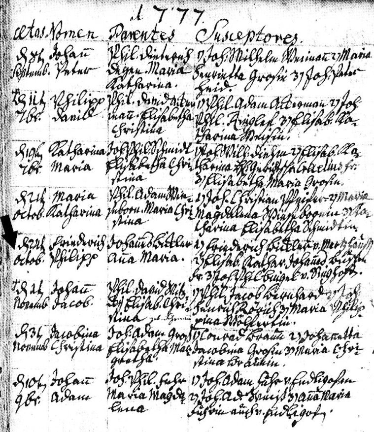 Geburtseintrag von Schinderhannes im Kirchenbuch von Miehlen: „Aetas (Alter): den 24ten Octob. (1777) Nomen (Namen): Friedrich Philipp Parentes (Eltern): Johannes Bickler / Anna Maria Susceptores (Paten): 1) Friedrich Bickler v. Mertzhausen 2) Elisab. Kathar. Johannes Buschen Fr(au) 3) Joh. Phil Bingel v. Singhofen“
