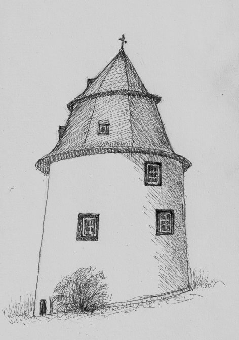 Schinderhannes-Turm in Simmern, aus dem Schinderhannes 1799 nach einem halben Jahr harter Haft entfliehen konnte. Illustration J. St. Porter.