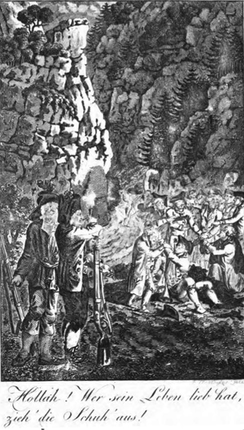 Abbildung in der Erstbiografie: Schinderhannes mit seinen zwei ständigen Gefährten zwingt eine größere Anzahl von Juden, ihre Schuhe auszuziehen. (Die Juden fielen allerdings bereits auf den Schinderhannes-Mythos herein und glaubten, dass die drei Räuber nur die Vorhut einer im Hinterhalt liegenden großen Bande seien).